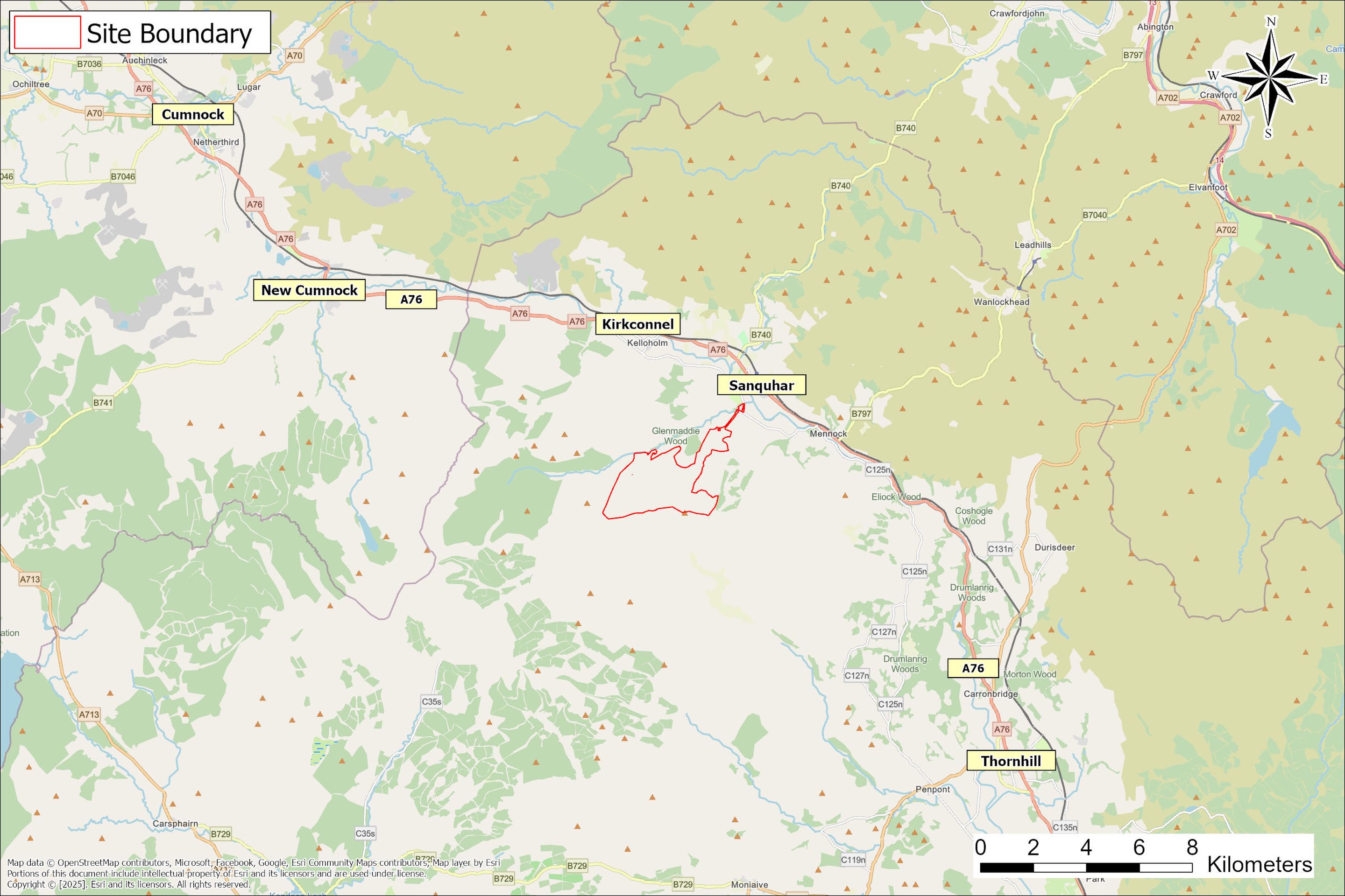 The site is close to the existing Whiteside Hill Wind Farm, approximately 4.5 km south of Sanquhar, and 4 km south-east of Kirkconnel, in Dumfries and Galloway.