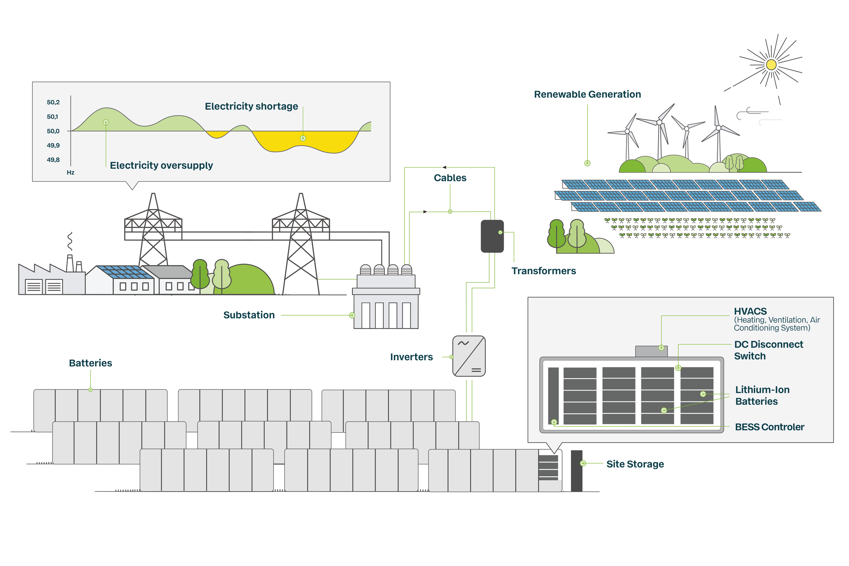Integrating battery energy storage systems (BESS) to our grid network helps solve the challenge of intermittent energy generation. Historically, when renewable energy generation couldn’t meet demand, we relied on non-renewable fuels like gas to balance our electricity network. A BESS can reduce our dependence on non-renewable energy and stabilise the grid by balancing supply and demand.